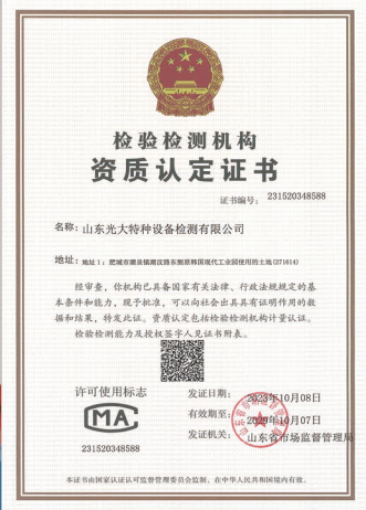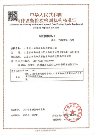 山東光大特種設(shè)備檢測(cè)有限公司是經(jīng)山東省市場(chǎng)監(jiān)督管理局核準(zhǔn)的甲類B1特種設(shè)備綜合檢驗(yàn)機(jī)構(gòu)。2017年9月30日取得了山東省市場(chǎng)監(jiān)督管理局頒發(fā)的《檢驗(yàn)檢測(cè)機(jī)構(gòu)資質(zhì)認(rèn)定證書》。2018年2月22日取得了山東省市場(chǎng)監(jiān)督管理局頒發(fā)的《特種設(shè)備檢驗(yàn)檢測(cè)機(jī)構(gòu)核準(zhǔn)證》(起重機(jī)械)檢驗(yàn)檢測(cè)資質(zhì)。2021年11月取得山東省市場(chǎng)監(jiān)督管理局版發(fā)的《特種設(shè)備檢驗(yàn)檢測(cè)機(jī)構(gòu)核準(zhǔn)證》(安全閥在線、離線)校驗(yàn)資質(zhì)。2023年11月取得山東省市場(chǎng)監(jiān)督管理局頒發(fā)的甲類檢驗(yàn)機(jī)構(gòu)B1《特種設(shè)備檢驗(yàn)檢測(cè)機(jī)構(gòu)核準(zhǔn)證》,具有壓力容器(RD2...